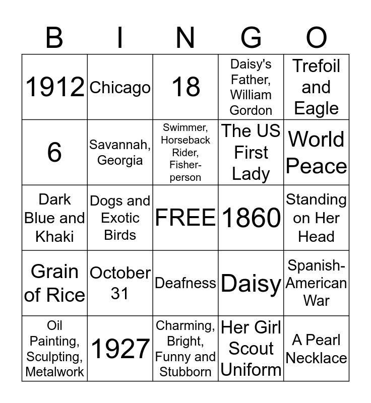 This bingo card has a free space and 29 words: Oil Painting, Sculpting, Metalwork, Sir Robert Baden Powell, Dogs and Exotic Birds, Poems and Plays, 1912, 18, Savannah, Georgia, October 31, 1860, 1927, Standing on Her Head, A Pearl Necklace, Charming, Bright, Funny and Stubborn, Her Girl Scout Uniform, World Peace, "Magic Thread", Deafness, Grain of Rice, Trefoil and Eagle, Dark Blue and Khaki, Daisy, England, The US First Lady, 6, Daisy's Father, William Gordon, Chicago, Spanish-American War, Swimmer, Horseback Rider, Fisher-person and March 12.