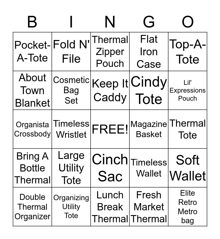 This bingo card has a free space and 24 words: Large Utility Tote, Organizing Utility Tote, Keep It Caddy, Double Thermal Organizer, Top-A-Tote, Pocket-A-Tote, About Town Blanket, Fold N' File, Magazine Basket, Cinch Sac, Cindy Tote, Organista Crossbody, Timeless Wallet, Soft Wallet, Cosmetic Bag Set, Fresh Market Thermal, Thermal Tote, Thermal Zipper Pouch, Lil' Expressions Pouch, Timeless Wristlet, Elite Retro Metro bag, Bring A Bottle Thermal, Flat Iron Case and Lunch Break Thermal.