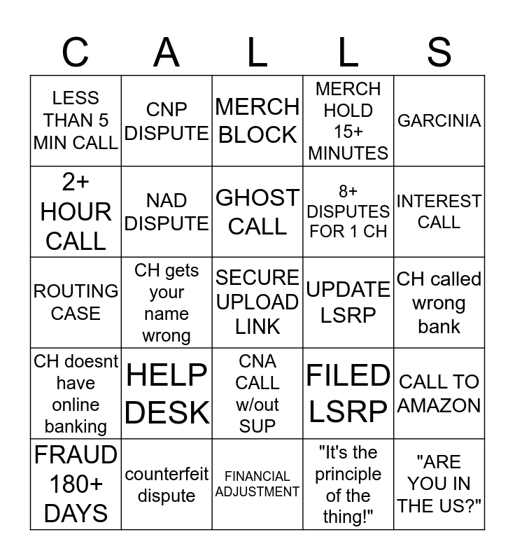 This bingo card has 25 words: HELP DESK, FINANCIAL ADJUSTMENT, GHOST CALL, FRAUD 180+ DAYS, GARCINIA, LESS THAN 5 MIN CALL, 2+ HOUR CALL, CNP DISPUTE, UPDATE LSRP, CNA CALL w/out SUP, 8+ DISPUTES FOR 1 CH, ROUTING CASE, FILED LSRP, CALL TO AMAZON, NAD DISPUTE, "ARE YOU IN THE US?", CH called wrong bank, MERCH BLOCK, INTEREST CALL, CH gets your name wrong, SECURE UPLOAD LINK, counterfeit dispute, CH doesnt have online banking, MERCH HOLD 15+ MINUTES and "It's the principle of the thing!".
