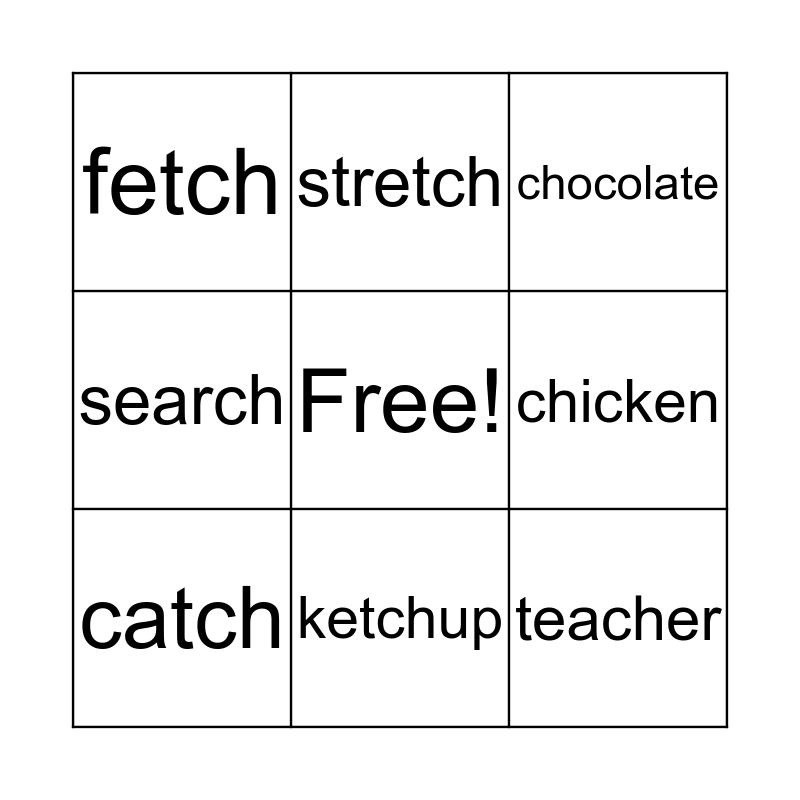 This bingo card has a free space and 13 words: choose, change, catch, stretch, search, teacher, compare, kitchen, ketchup, fetch, chicken, chocolate and watch.