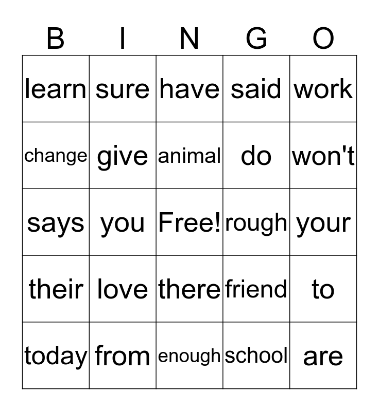 This bingo card has a free space and 24 words: love, from, animal, today, work, learn, change, sure, rough, there, do, says, friend, to, give, school, your, have, won't, you, are, their, said and enough.