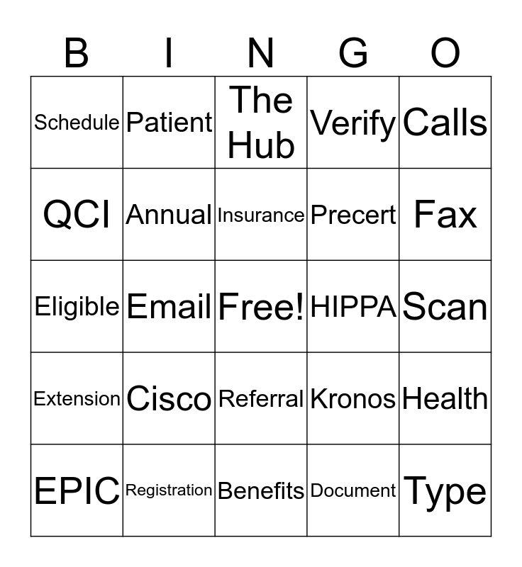 This bingo card has a free space and 24 words: Cisco, Registration, Insurance, EPIC, Calls, Schedule, QCI, Patient, HIPPA, Referral, Precert, Eligible, Kronos, Health, Annual, Document, Scan, The Hub, Fax, Email, Type, Extension, Verify and Benefits.