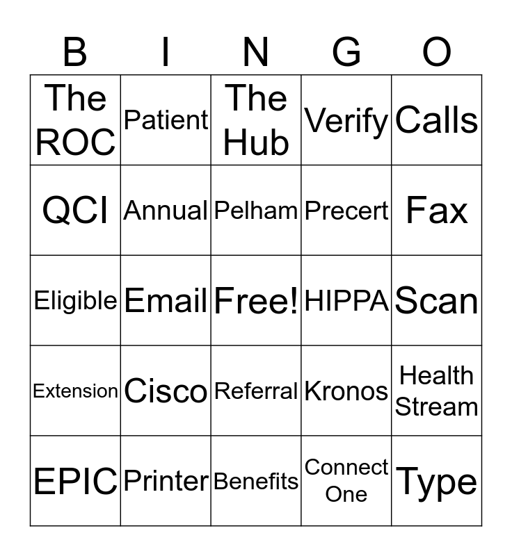 This bingo card has a free space and 24 words: Cisco, Printer, Pelham, EPIC, Calls, The ROC, QCI, Patient, HIPPA, Referral, Precert, Eligible, Kronos, Health Stream, Annual, Connect One, Scan, The Hub, Fax, Email, Type, Extension, Verify and Benefits.