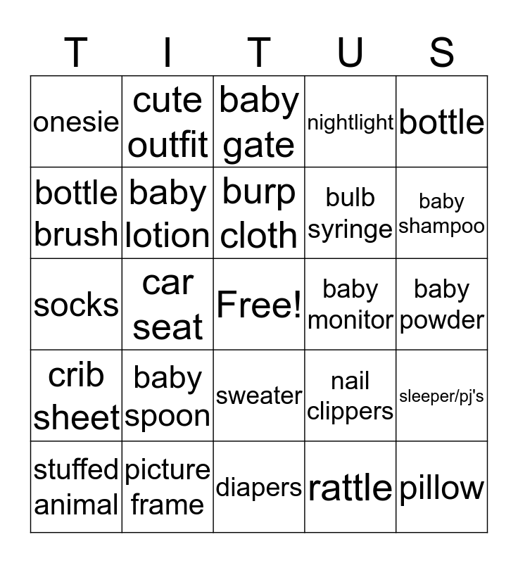 This bingo card has a free space and 24 words: baby spoon, picture frame, burp cloth, stuffed animal, bottle, onesie, bottle brush, cute outfit, baby monitor, sweater, bulb syringe, socks, nail clippers, sleeper/pj's, baby lotion, rattle, baby powder, baby gate, baby shampoo, car seat, pillow, crib sheet, nightlight and diapers.