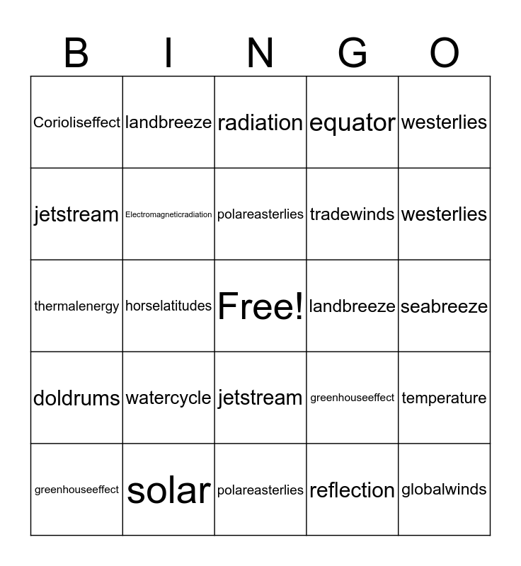 This bingo card has a free space and 39 words: solar, conduction, Corioliseffect, Electromagneticradiation, greenhouseeffect, jetstream, polareasterlies, tradewinds, westerlies, doldrums, horselatitudes, equator, globalwinds, seabreeze, landbreeze, watercycle, conduction, Corioliseffect, Electromagneticradiation, greenhouseeffect, jetstream, polareasterlies, tradewinds, westerlies, doldrums, horselatitudes, equator, globalwinds, seabreeze, landbreeze, watercycle, convection, radiation, solar, reflection, clouds, temperature, thermalenergy and scattering.