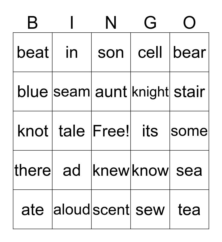 This bingo card has a free space and 24 words: ad, aloud, aunt, ate, bear, beat, blue, in, its, knew, knight, knot, know, sea, seam, sew, some, son, stair, tale, tea, there, cell and scent.