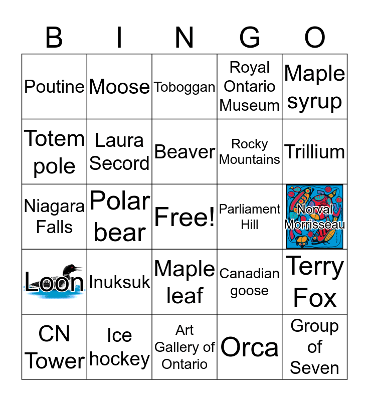 This bingo card has 2 images, a free space and 24 words: Inuksuk, Ice hockey, Beaver, CN Tower, Maple syrup, Poutine, Totem pole, Moose, Parliament Hill, Maple leaf, Rocky Mountains, Niagara Falls, Canadian goose, Terry Fox, Laura Secord, Orca, Norval Morrisseau, Toboggan, Trillium, Polar bear, Group of Seven, Loon, Royal Ontario Museum and Art Gallery of Ontario.