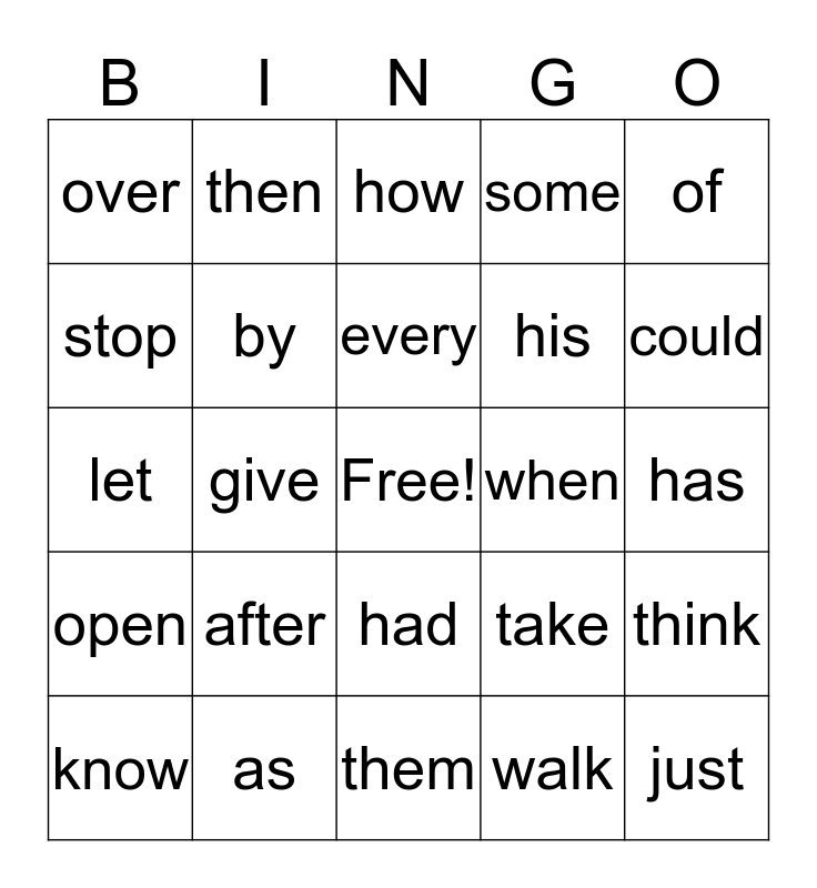 This bingo card has a free space and 24 words: after, as, every, know, of, over, stop, then, when, had, his, let, take, think, by, walk, has, how, could, give, just, open, some and them.