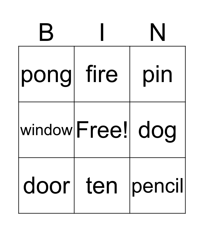 This bingo card has a free space and 10 words: ten, pin, pong, pencil, window, door, fire, food, dog and cat.