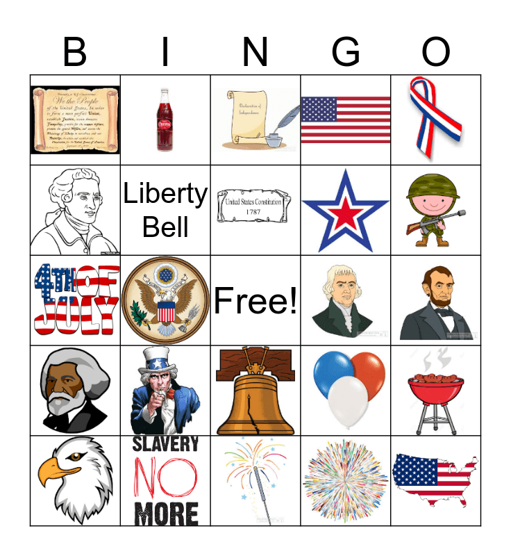 This bingo card has 24 images, a free space and 2 words: Liberty Bell and Preamble.