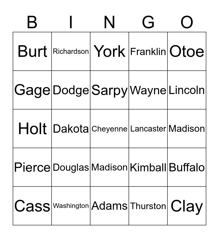 This bingo card has a free space and 24 words: Douglas, Washington, Sarpy, Cass, Otoe, Burt, Gage, Richardson, Lancaster, Madison, Wayne, Holt, Kimball, Buffalo, Dodge, Thurston, Madison, York, Lincoln, Dakota, Clay, Pierce, Franklin and Adams.