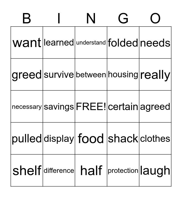 This bingo card has a free space and 24 words: display, difference, between, shelf, needs, want, greed, learned, certain, food, housing, necessary, shack, clothes, survive, protection, agreed, understand, really, savings, laugh, pulled, folded and half.