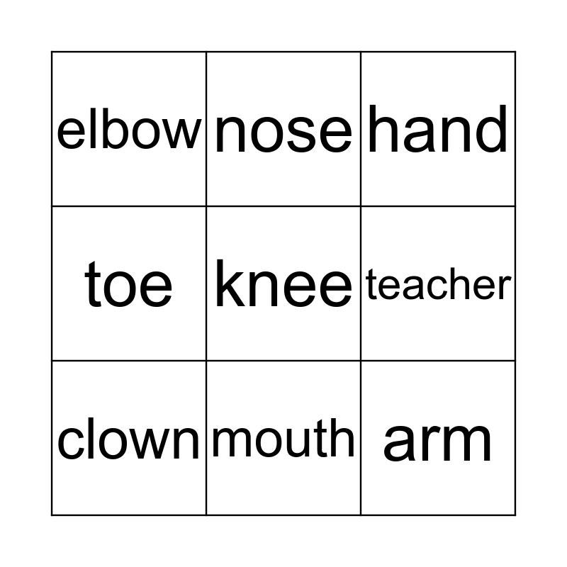 This bingo card has 18 words: eye, ear, hand, elbow, leg, toe, head, nose, mouth, arm, finger, knee, magician, teacher, clown, cool, cute and funny.