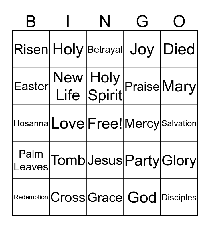 This bingo card has a free space and 26 words: Jesus, God, Holy Spirit, Cross, Died, Risen, Easter, Holy, Salvation, Party, Praise, Hosanna, Glory, Redemption, Love, Peace, Joy, Palm Leaves, Betrayal, Disciples, Mary, Grace, Mercy, Tomb, New Life and Freedom.