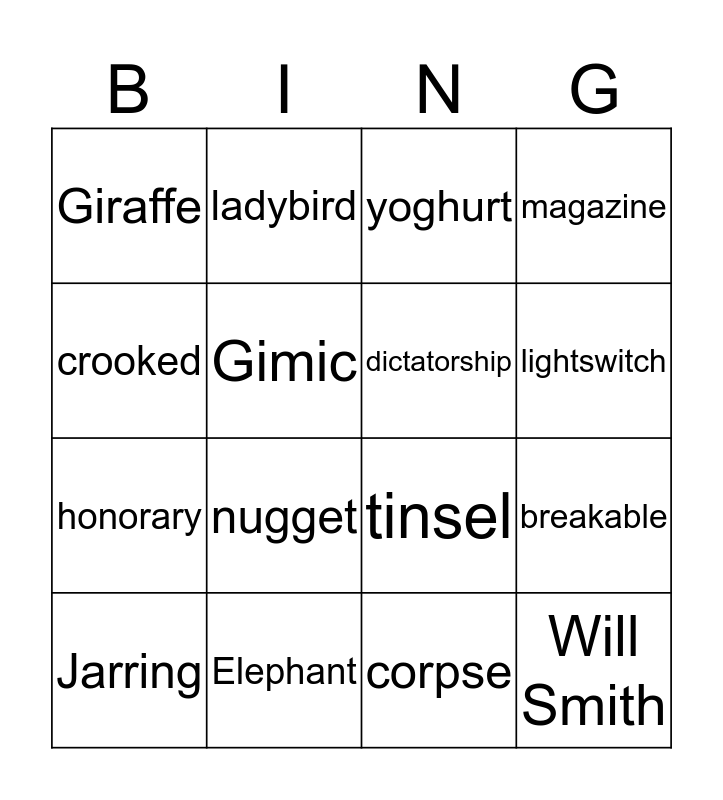 This bingo card has 16 words: Elephant, breakable, yoghurt, Giraffe, honorary, ladybird, tinsel, corpse, crooked, Gimic, Jarring, magazine, nugget, lightswitch, dictatorship and Will Smith.