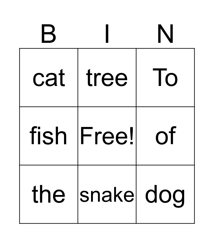 This bingo card has a free space and 8 words: of, To, tree, the, cat, dog, fish and snake.