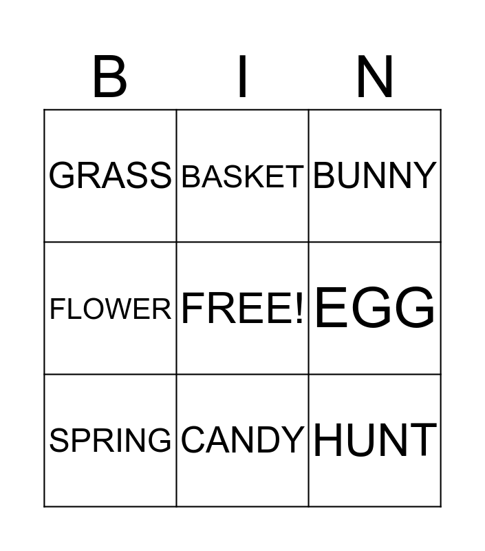 This bingo card has a free space and 8 words: EGG, BUNNY, BASKET, SPRING, GRASS, HUNT, FLOWER and CANDY.