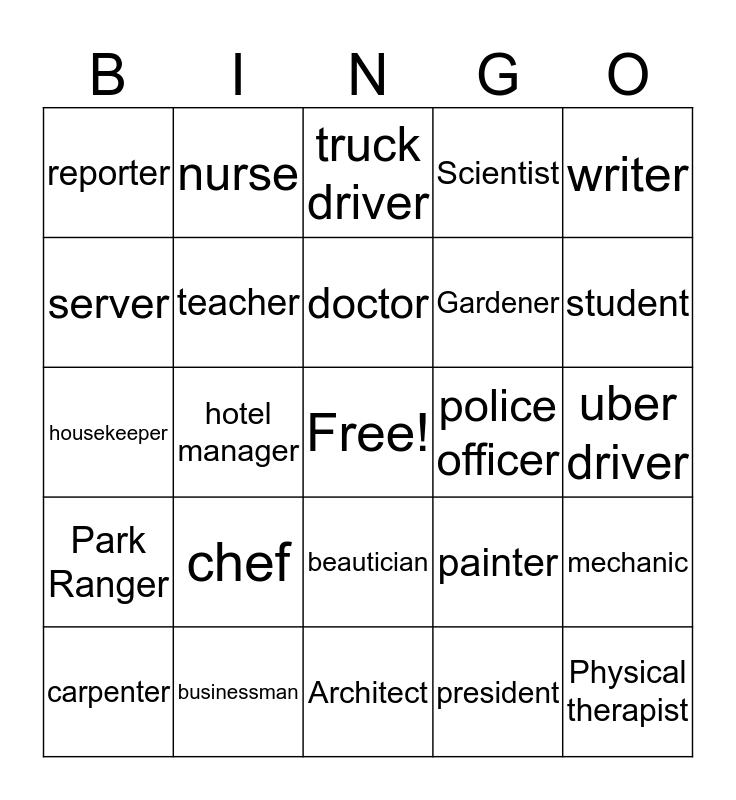 This bingo card has a free space and 24 words: chef, businessman, doctor, carpenter, writer, reporter, server, nurse, police officer, beautician, Gardener, housekeeper, painter, mechanic, teacher, president, uber driver, truck driver, student, hotel manager, Physical therapist, Park Ranger, Scientist and Architect.