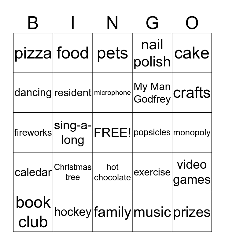 This bingo card has a free space and 24 words: Christmas tree, hockey, microphone, book club, cake, pizza, dancing, food, popsicles, hot chocolate, My Man Godfrey, fireworks, exercise, video games, resident, music, monopoly, pets, crafts, sing-a-long, prizes, caledar, nail polish and family.