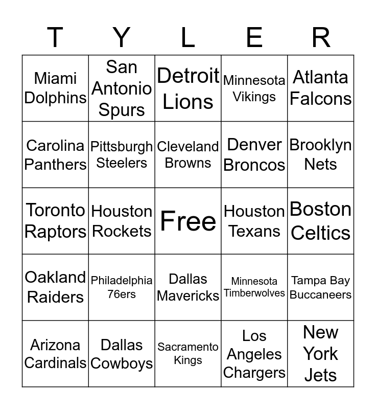 This bingo card has a free space and 62 words: New England Partiots, Dallas Cowboys, Philadelphia Eagles, Oakland Raiders, New York Giants, Seattle Seahawks, Pittsburgh Steelers, Green Bay Packers, Denver Broncos, San Francisco 49ers, Minnesota Vikings, Chicago Bears, Carolina Panthers, Los Angeles Rams, Washington Redskins, Miami Dolphins, New York Jets, Atlanta Falcons, Baltimore Ravens, Cleveland Browns, Houston Texans, Detroit Lions, Arizona Cardinals, Los Angeles Chargers, Buffalo Bills, New Orleans Saints, Jacksonville Jaguars, Cincinnati Bengals, Tampa Bay Buccaneers, Indianapolis Colts, Tennessee Titans, Cleveland Cavaliers, Golden State Warriors, Los Angeles Lakers, Boston Celtics, San Antonio Spurs, Oklahoma City Thunder, New York Knicks, Houston Rockets, Chicago Bulls, Toronto Raptors, Miami Heat, Philadelphia 76ers, Los Angeles Clippers, Brooklyn Nets, Minnesota Timberwolves, Milwaukee Bucks, New Orleans Pelicans, Phoenix Suns, Portland Trail Blazers, Dallas Mavericks, Sacramento Kings, Detroit Pistons, Washington Wizards, Utah Jazz, Indiana Pacers, Atlanta Hawks, Memphis Grizzlies, Denver Nuggets, Orlando Magic, Charlotte Hornets and Kansas City Chiefs.