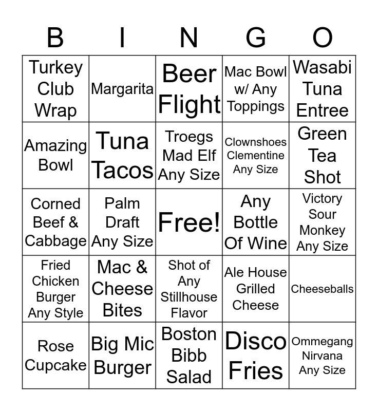 This bingo card has a free space and 24 words: Mac & Cheese Bites, Big Mic Burger, Troegs Mad Elf Any Size, Rose Cupcake, Wasabi Tuna Entree, Turkey Club Wrap, Amazing Bowl, Margarita, Any Bottle Of Wine, Shot of Any Stillhouse Flavor, Clownshoes Clementine Any Size, Corned Beef & Cabbage, Ale House Grilled Cheese, Cheeseballs, Tuna Tacos, Disco Fries, Victory Sour Monkey Any Size, Beer Flight, Green Tea Shot, Palm Draft Any Size, Ommegang Nirvana Any Size, Fried Chicken Burger Any Style, Mac Bowl w/ Any Toppings and Boston Bibb Salad.