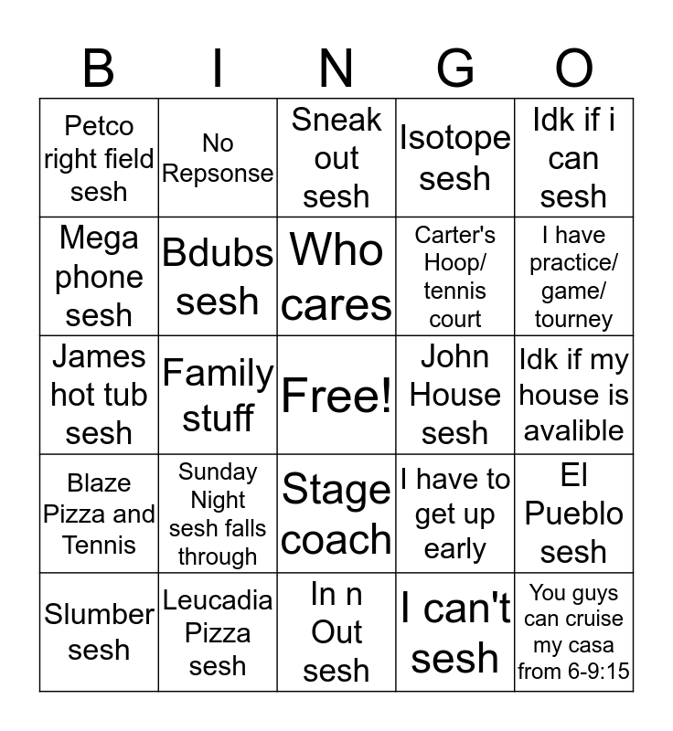 This bingo card has a free space and 24 words: Sunday Night sesh falls through, Leucadia Pizza sesh, Who cares, Slumber sesh, Idk if i can sesh, Petco right field sesh, Mega phone sesh, No Repsonse, John House sesh, Stage coach, Carter's Hoop/ tennis court, James hot tub sesh, I have to get up early, El Pueblo sesh, Bdubs sesh, I can't sesh, Idk if my house is avalible, Sneak out sesh, I have practice/ game/ tourney, Family stuff, You guys can cruise my casa from 6-9:15, Blaze Pizza and Tennis, Isotope sesh and In n Out sesh.