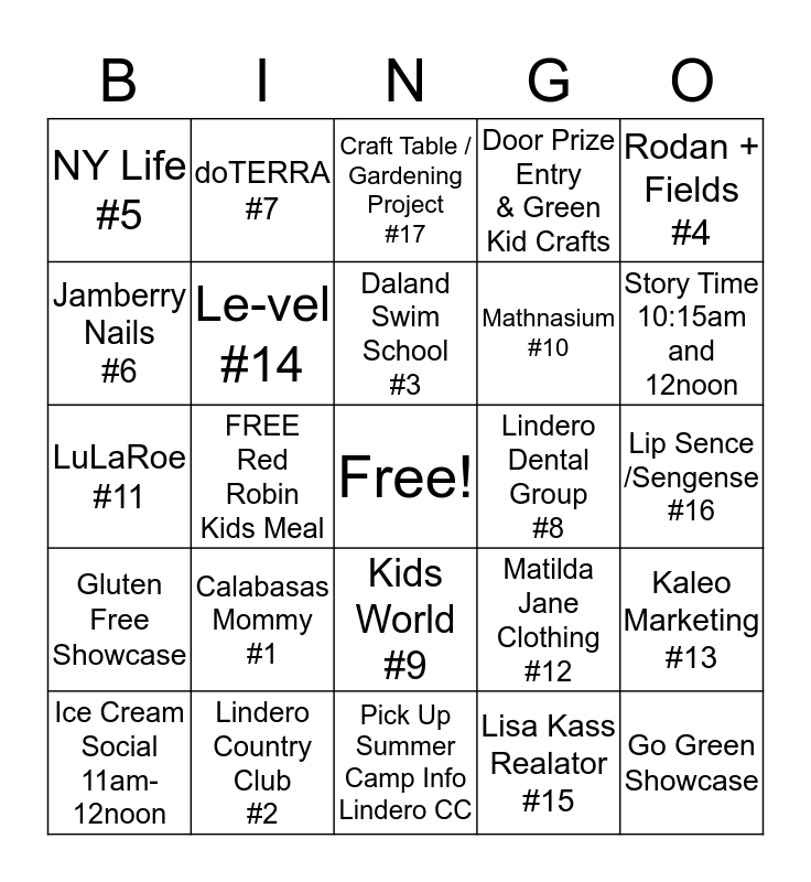 This bingo card has a free space and 24 words: Calabasas Mommy #1, Lindero Country Club #2, Daland Swim School #3, Ice Cream Social 11am-12noon, Rodan + Fields #4, NY Life #5, Jamberry Nails #6, doTERRA #7, Lindero Dental Group #8, Kids World #9, Mathnasium #10, LuLaRoe #11, Matilda Jane Clothing #12, Kaleo Marketing #13, Le-vel #14, Lisa Kass Realator #15, Lip Sence /Sengense #16, Craft Table / Gardening Project #17, Story Time 10:15am and 12noon, FREE Red Robin Kids Meal, Go Green Showcase, Gluten Free Showcase, Door Prize Entry & Green Kid Crafts and Pick Up Summer Camp Info Lindero CC.