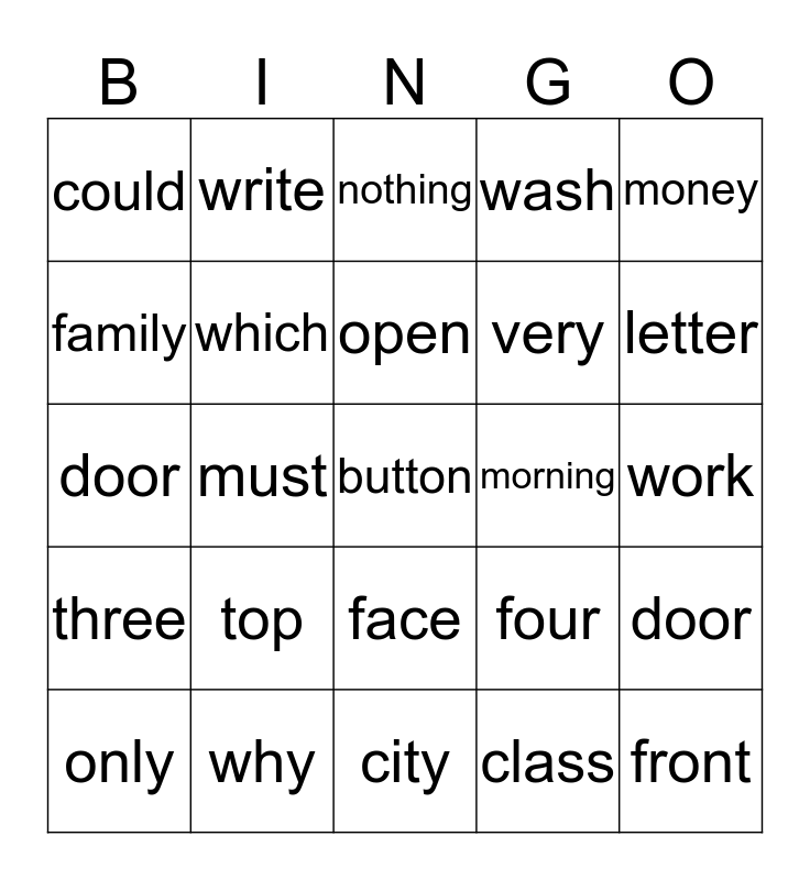 This bingo card has 25 words: top, city, open, only, money, could, family, write, morning, face, very, door, four, door, which, front, work, nothing, letter, must, button, why, three, wash and class.