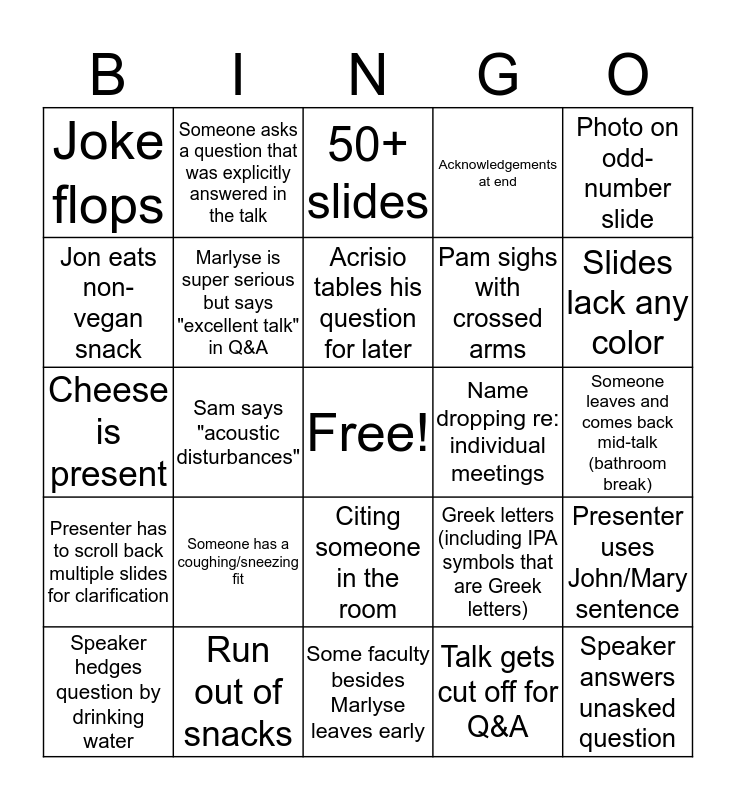 This bingo card has a free space and 44 words: Projector difficulties, Speaker answers unasked question, Speaker doesn't answer asked question, Speaker hedges question by drinking water, Phone ringer goes off, Talk gets cut off for Q&A, 50+ slides, Someone asks a question during the talk, Photo on odd-number slide, Run out of snacks, Acknowledgements at end, Name dropping re: individual meetings, Citing someone in the room, Someone has a coughing/sneezing fit, Someone comes in late, Some faculty besides Marlyse leaves early, Phone goes off, Cheese is present, Audience laughs, Slides lack any color, Someone asks a question that was explicitly answered in the talk, Trees in the slides, Slide animations/transitions, Joke flops, Speaker references personal life (family, hobbies, pet, etc.), Someone leaves and comes back mid-talk (bathroom break), Somebody asks if we’re starting on Michigan time, Cross-linguistic comparison, Greek letters (including IPA symbols that are Greek letters), Presenter has to scroll back multiple slides for clarification, Presenter cites themself in their slides, Presenter uses John/Mary sentence, Mention of Chomsky, Presenter sits on a table, Sam says "acoustic disturbances", Jon vigorously nods, Ezra asks a long-form question w/o eye contact but w/gestures, Andries indiscreetly uses phone during the talk, Acrisio tables his question for later, Jon eats non-vegan snack, Pam sighs with crossed arms, Marlyse ducks out early, Marlyse is super serious but says "excellent talk" in Q&A and Robin pushes bangs back during her question.