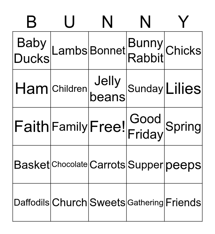 This bingo card has a free space and 26 words: Carrots, Gathering, Jelly beans, Church, Chicks, Baby Ducks, Ham, Lambs, Spring, Supper, Sunday, Faith, peeps, Daffodils, Family, Easter bunny, Bunny Rabbit, Basket, Bonnet, Friends, Lilies, Sweets, Good Friday, Chocolate, Children and Tulips.