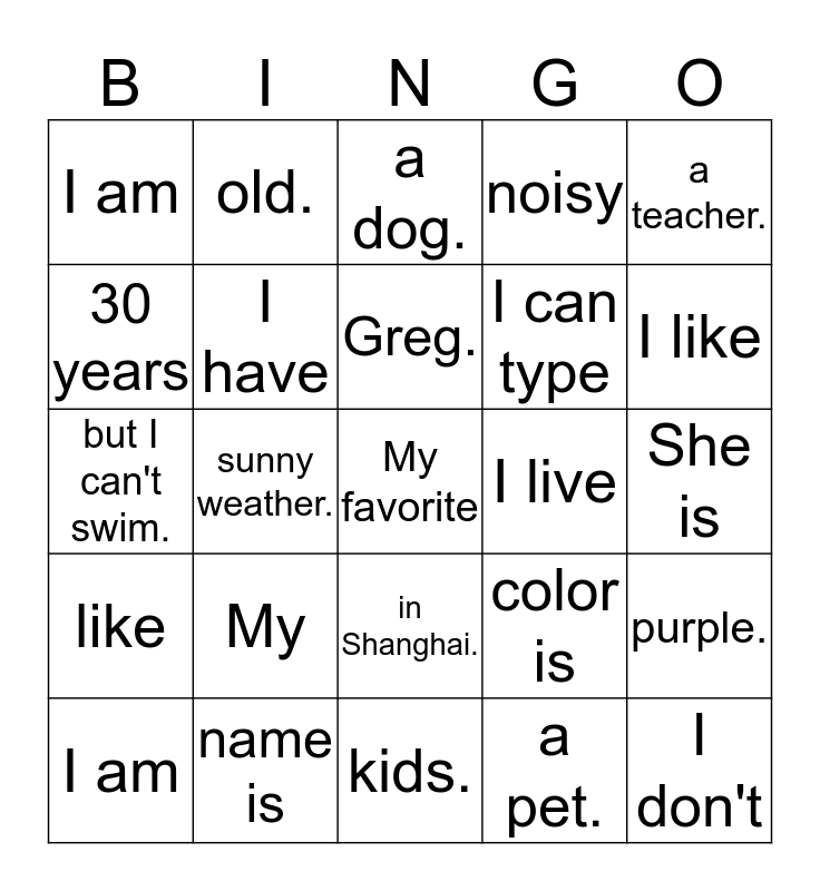 This bingo card has a free space and 24 words: My, name is, Greg., I am, a teacher., I am, 30 years, old., I live, in Shanghai., I can type, but I can't swim., color is, purple., I have, a pet., She is, a dog., I like, sunny weather., I don't, like, noisy and kids..