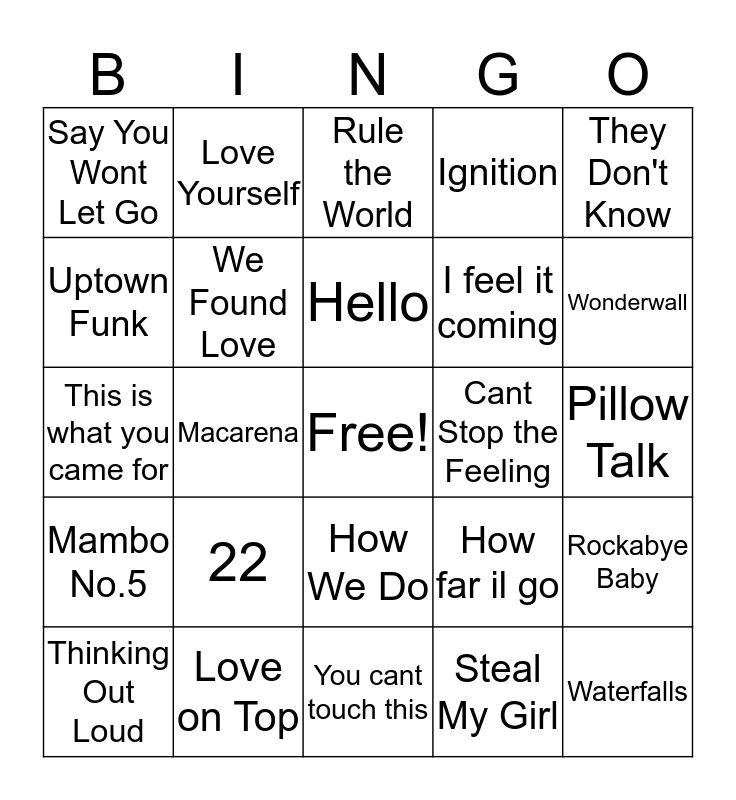 This bingo card has a free space and 24 words: 22, Love on Top, Hello, Thinking Out Loud, They Don't Know, Say You Wont Let Go, Uptown Funk, Love Yourself, Cant Stop the Feeling, How We Do, I feel it coming, This is what you came for, How far il go, Rockabye Baby, We Found Love, Steal My Girl, Pillow Talk, Rule the World, Wonderwall, Macarena, Waterfalls, Mambo No.5, Ignition and You cant touch this.
