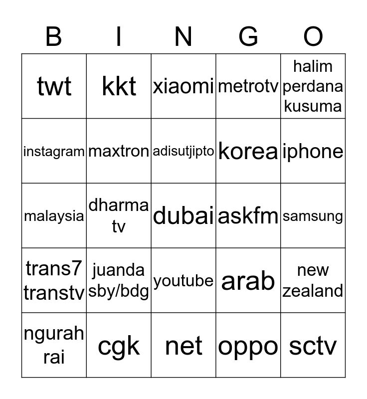 This bingo card has a free space and 24 words: juanda sby/bdg, cgk, adisutjipto, ngurah rai, halim perdana kusuma, twt, instagram, kkt, askfm, youtube, korea, malaysia, arab, new zealand, maxtron, oppo, samsung, xiaomi, iphone, dharma tv, sctv, trans7 transtv, metrotv and net.