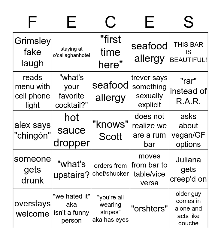 This bingo card has a free space and 29 words: overstays welcome, "nothing too sweet", hot sauce dropper, instafood, Grimsley fake laugh, "first time here", "what's your favorite cocktail?", "what's upstairs?, does not realize we are a rum bar, "we hated it" aka isn't a funny person, asks about vegan/GF options, older guy comes in alone and acts like douche, "you're all wearing stripes" aka has eyes, "orshters", "rar" instead of R.A.R., cooked food, orders from chef/shucker, someone gets drunk, THIS BAR IS BEAUTIFUL!, alex says "chingón", moves from bar to table/vice versa, comments on water bottles, trever says something sexually explicit, reads menu with cell phone light, seafood allergy, staying at o'callaghanhotel, Juliana gets creep'd on, seafood allergy and found us on the internet.