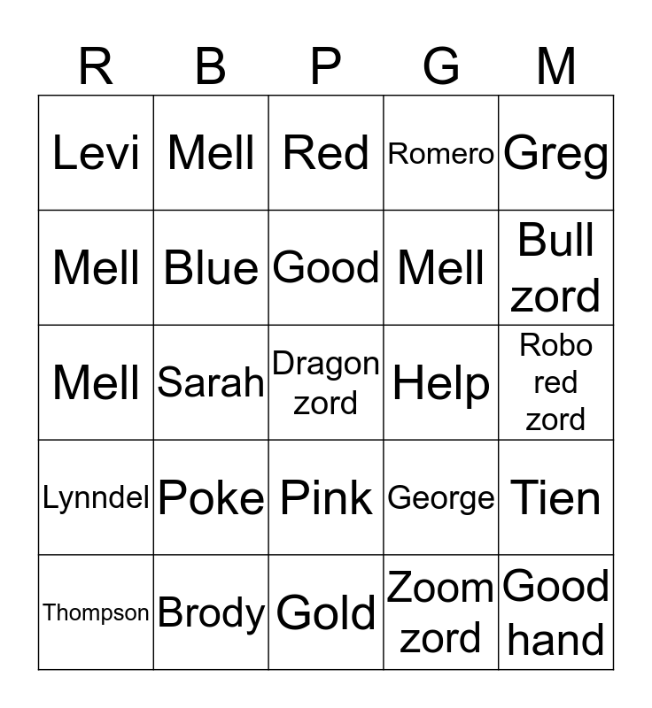 This bingo card has 30 words: Brody, Preston, Sarah, Mick, Levi, Red, Blue, Pink, Help, Gold, Robo red zord, Dragon zord, Zoom zord, Good hand, Bull zord, Kristine, George, Lynndel, Poke, Greg, Mell, Griffie, Mell, Mell, Mell, Romero, Tien, Thompson, Good and Weston.