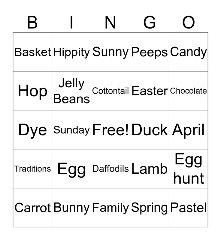 This bingo card has a free space and 24 words: Egg, Bunny, Cottontail, Carrot, Candy, Basket, Hop, Hippity, Duck, Daffodils, Easter, Dye, Lamb, Egg hunt, Jelly Beans, Spring, April, Sunny, Chocolate, Sunday, Pastel, Traditions, Peeps and Family.