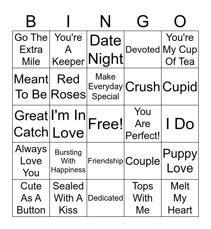 This bingo card has a free space and 24 words: Bursting With Happiness, Sealed With A Kiss, Make Everyday Special, Cute As A Button, You're My Cup Of Tea, Go The Extra Mile, Meant To Be, You're A Keeper, You Are Perfect!, Friendship, Crush, Great Catch, Couple, Puppy Love, Red Roses, Tops With Me, I Do, Date Night, Cupid, I'm In Love, Melt My Heart, Always Love You, Devoted and Dedicated.