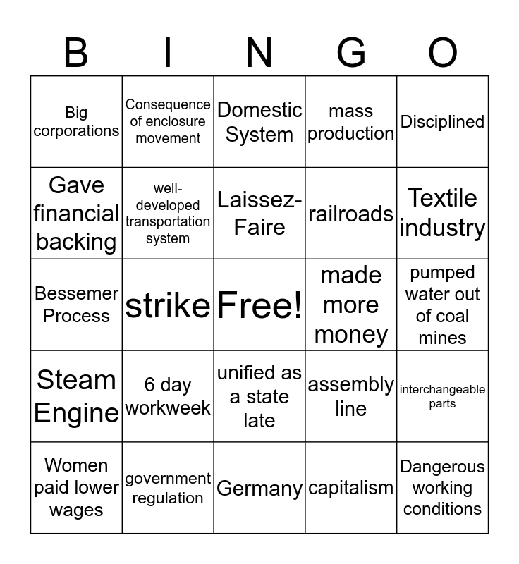 This bingo card has a free space and 24 words: 6 day workweek, government regulation, Laissez-Faire, Women paid lower wages, Disciplined, Big corporations, Gave financial backing, Consequence of enclosure movement, made more money, unified as a state late, railroads, Bessemer Process, assembly line, interchangeable parts, well-developed transportation system, capitalism, pumped water out of coal mines, Domestic System, Textile industry, strike, Dangerous working conditions, Steam Engine, mass production and Germany.