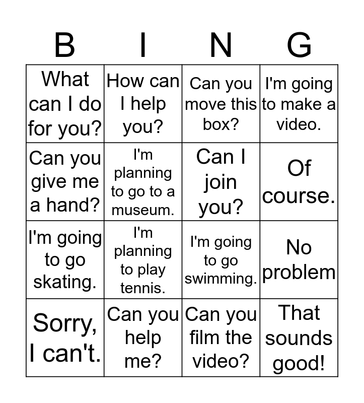 This bingo card has 20 words: No problem, Can you open the door?, Can you move this box?, Can you fix the computer, Sorry, I can't., Can you give me a hand?, Can you help me?, What can I do for you?, I'm going to go skating., How can I help you?, I'm planning to play tennis., I'm going to go swimming., I'm planning to go to a museum., That sounds good!, Can I join you?, What are you plans for Tuesday?, Of course., I'm going to make a video., Can you film the video? and Can you empty te trash can?.