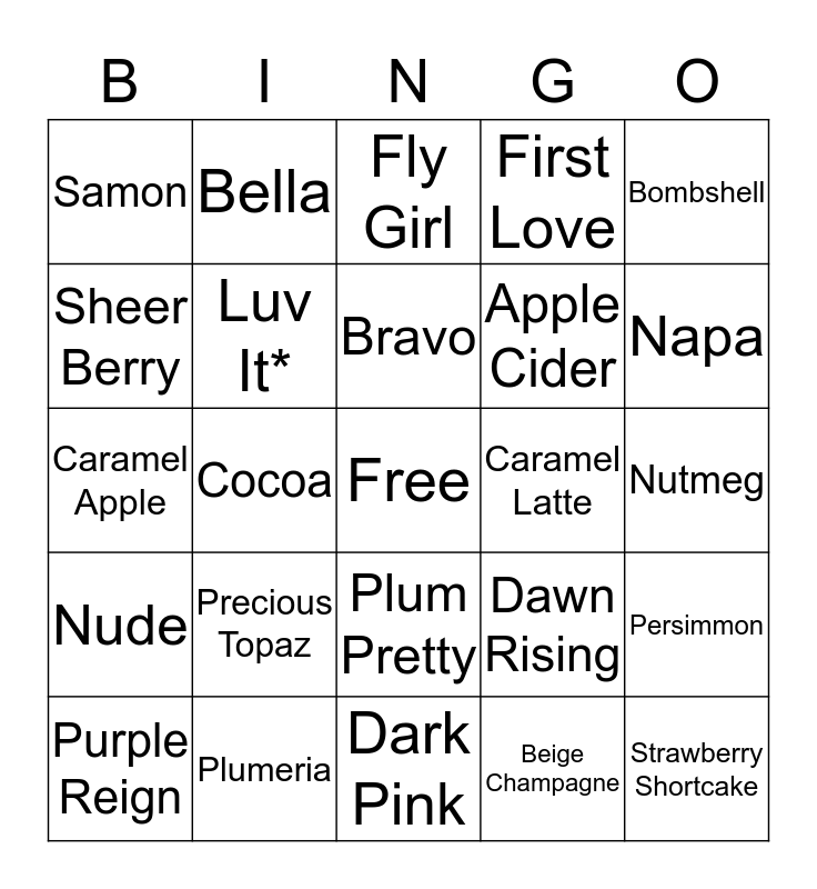 This bingo card has a free space and 24 words: Precious Topaz, Plumeria, Bravo, Purple Reign, Bombshell, Samon, Sheer Berry, Bella, Caramel Latte, Plum Pretty, Apple Cider, Caramel Apple, Dawn Rising, Persimmon, Luv It*, Beige Champagne, Nutmeg, Fly Girl, Napa, Cocoa, Strawberry Shortcake, Nude, First Love and Dark Pink.