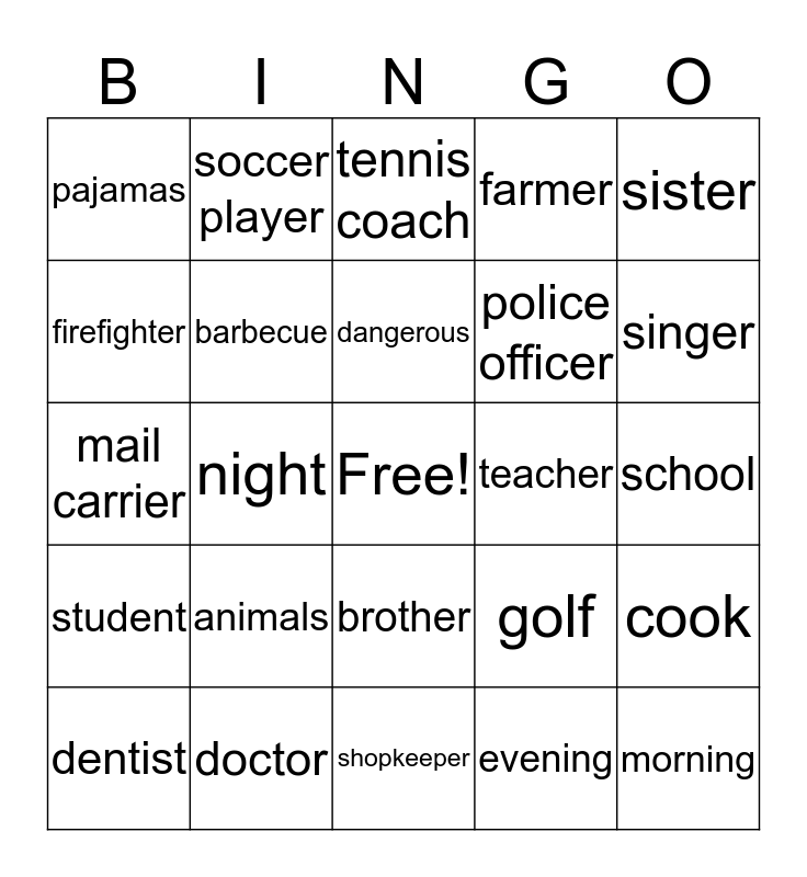 This bingo card has a free space and 27 words: golf, teacher, police officer, shopkeeper, firefighter, tennis coach, soccer player, student, teacher, cook, mail carrier, farmer, dentist, doctor, singer, who is she, barbecue, dangerous, animals, pajamas, school, evening, night, morning, brother, sister and hungry.