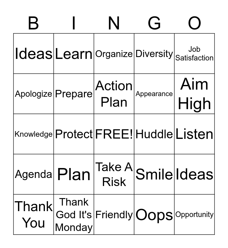This bingo card has a free space and 24 words: Plan, Thank God It's Monday, Action Plan, Thank You, Job Satisfaction, Ideas, Apologize, Learn, Huddle, Take A Risk, Appearance, Knowledge, Smile, Ideas, Prepare, Oops, Listen, Organize, Aim High, Protect, Opportunity, Agenda, Diversity and Friendly.