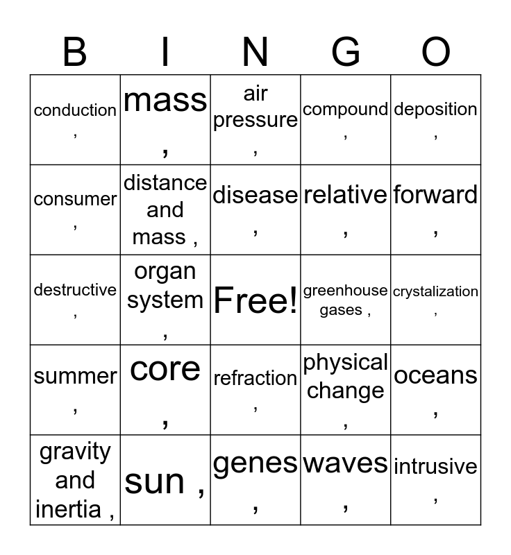 This bingo card has a free space and 79 words: acid ,, adaptation ,, air pressure ,, amplitude ,, asexual ,, balanced ,, carbon dioxide ,, cell wall ,, chemical change ,, chloroplast ,, community ,, composition ,, compound ,, conduction ,, constructive ,, consumer ,, convection ,, core ,, coriolis ,, crystalization ,, deeper ,, deposition ,, destructive ,, disease ,, distance and mass ,, divide ,, eclipse ,, element ,, extinction ,, extrusive ,, forward ,, frequency ,, genes ,, glaciers ,, gravity and inertia ,, greenhouse gases ,, hardness ,, host ,, igneous ,, intrusive ,, kinetic ,, law of conservation of mass ,, lithosphere ,, luster ,, mantle ,, mass ,, metamorphic ,, mixture ,, molecule ,, non ,, oceans ,, organ system ,, physical change ,, plate boundary ,, population ,, potential ,, prey ,, producer ,, reflection ,, refraction ,, relative ,, reservoir ,, revolve ,, rotate ,, sea breeze ,, sedimentary ,, seismic wave ,, speed ,, streak ,, summer ,, sun ,, superposition ,, tilt ,, underground ,, uneven heating ,, waves ,, weight ,, wind , and winter ,.