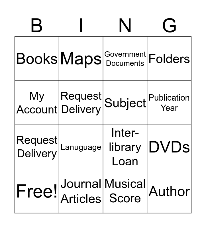 This bingo card has 16 words: Journal Articles, DVDs, Government Documents, Books, Request Delivery, Maps, Inter-library Loan, Musical Score, My Account, Request Delivery, Free!, Folders, Lanuguage, Publication Year, Subject and Author.