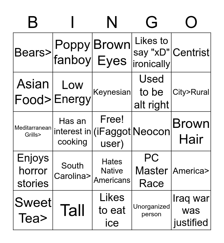 This bingo card has a free space and 24 words: South Carolina>, Tall, Keynesian, Sweet Tea>, Centrist, Bears>, Asian Food>, Poppy fanboy, Neocon, Hates Native Americans, Used to be alt right, Meditarranean Grills>, PC Master Race, America>, Low Energy, Unorganized person, Brown Hair, Brown Eyes, City>Rural, Has an interest in cooking, Iraq war was justified, Enjoys horror stories, Likes to say "xD" ironically and Likes to eat ice.
