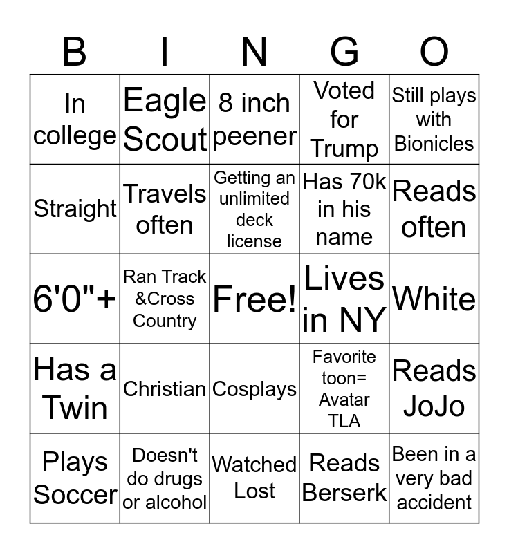 This bingo card has a free space and 24 words: Christian, Doesn't do drugs or alcohol, Getting an unlimited deck license, Plays Soccer, Still plays with Bionicles, In college, Straight, Eagle Scout, Lives in NY, Cosplays, Has 70k in his name, 6'0"+, Favorite toon= Avatar TLA, Reads JoJo, Travels often, Reads Berserk, White, 8 inch peener, Reads often, Ran Track &Cross Country, Been in a very bad accident, Has a Twin, Voted for Trump and Watched Lost.