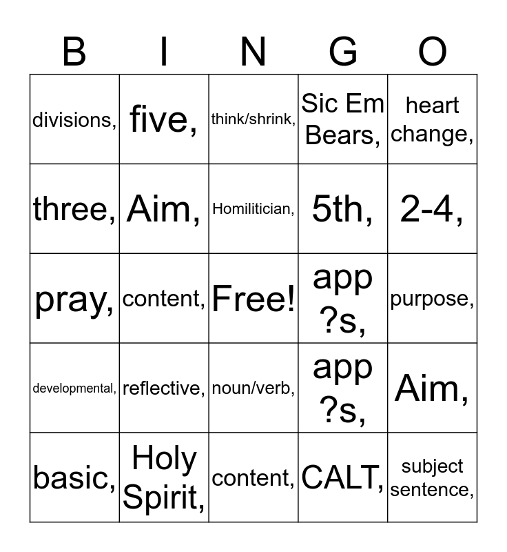 This bingo card has a free space and 31 words: content,, divisions,, content,, lesson,, divisions,, think/shrink,, Aim,, app ?s,, app ?s,, CALT,, purpose,, subject sentence,, 10-20,, Facts,, 2-4,, ten,, Aim,, reflective,, developmental,, noun/verb,, heart change,, May 3,, basic,, five,, 5th,, three,, Sic Em Bears,, pray,, Holy Spirit,, Homilitician, and May 10th.