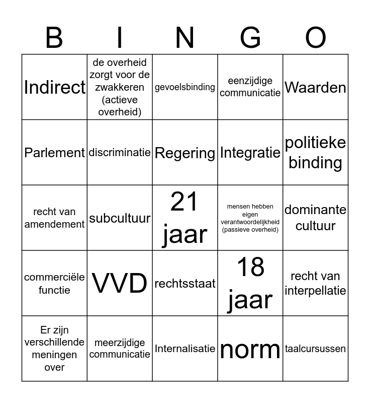 This bingo card has 25 words: VVD, Internalisatie, Regering, Er zijn verschillende meningen over, Waarden, Indirect, Parlement, de overheid zorgt voor de zwakkeren (actieve overheid), mensen hebben eigen verantwoordelijkheid (passieve overheid), rechtsstaat, Integratie, recht van amendement, 18 jaar, recht van interpellatie, discriminatie, taalcursussen, dominante cultuur, gevoelsbinding, politieke binding, subcultuur, 21 jaar, meerzijdige communicatie, commerciële functie, eenzijdige communicatie and norm.