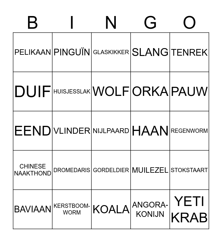 This bingo card has a free space and 79 words: MUG, MAMMOET, GLASKIKKER, UIL, IJSBEER, ELAND, ZEESTER, MIERENEGEL, MANISJE, GOENDI, AXOLOTL, NEUSAAP, SLANG, PELIKAAN, JAGUAR, DUIF, WEZEL, DROMEDARIS, ZEEMEEUW, REGENWORM, CHINCHILLA, TENREK, EEND, WOLF, HUISJESSLAK, HERT, ZEEKOE, BEVER, ZWAAN, EVERZWIJN, PAUW, REIGER, KOALA, FRET, BAVIAAN, HAAN, STRUISVOGEL, VOS, KREKEL, YETI KRAB, BLOKVIS, EEKHOORN, GORDELMOL, WALVIS, ALPACA, PINGUÏN, VLIEG, PAPAGAAI, GOUDVIS, MIERENETER, STOKSTAART, VLINDER, MUILEZEL, VINGERDIER, WESP, NAAKTRAT, EZEL, GEIT, LEEUW, GORDELDIER, ORKA, MIER, SPIN, PAARD, WATUSIRUND, PANTER, MUIS, POES, DOMBO OCTOPUS, CHINESE NAAKTHOND, KERSTBOOM- WORM, JACHT- LUIPAARD, HANGBUIK- VARKEN, AFRIKAANSE MARABOE, GROTE RAFELVIS, ANGORA- KONIJN, DWERGZIJDE- AAPJE, KRAAG- HAGEDIS and REUZEN- PISSEBED.