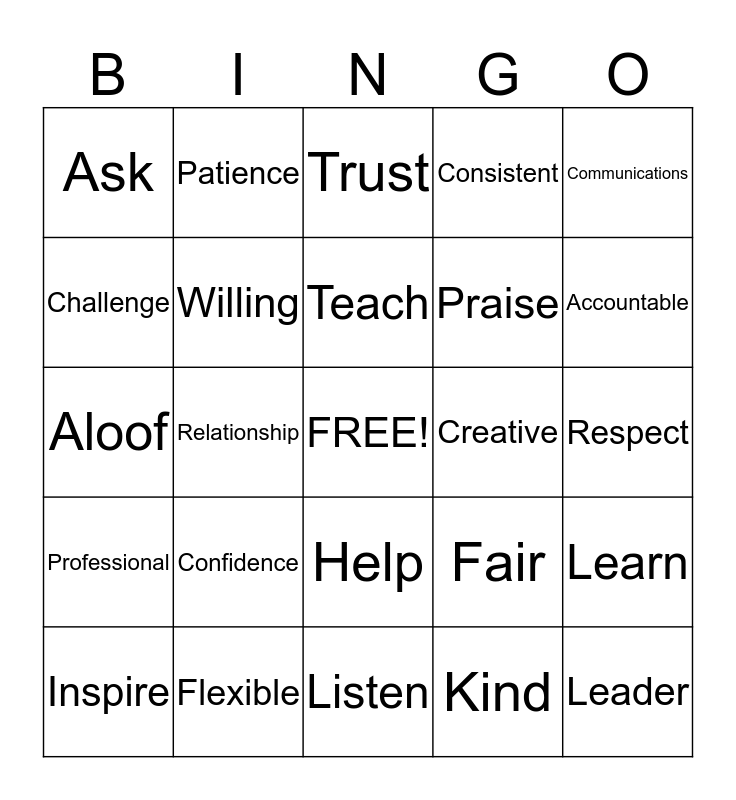 This bingo card has a free space and 24 words: Confidence, Flexible, Teach, Inspire, Communications, Ask, Challenge, Patience, Creative, Help, Praise, Aloof, Fair, Learn, Willing, Kind, Respect, Trust, Accountable, Relationship, Leader, Professional, Consistent and Listen.